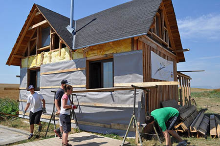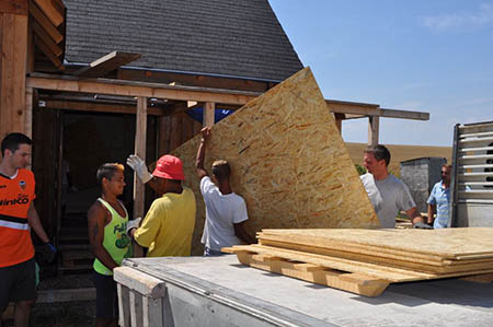 Diese Summe ermöglichte es dem Verein, seine Hilfsengagement in Rumänien fortzuführen. Ende August fuhren die freiwilligen Helfer mit zwei vollbeladene Sattelschleppern mit Hilfsgütern und Baumaterial nach Luncani. Mit im "Gepäck": Zwölf Schülerinnen und Schüler des Stiftsgymnasiums, die selbst ihre Ärmel hochkrempeln und bei der »Hilfe zur Selbsthilfe« mitanpacken wollten. In der Woche vom 2. bis 7. August hatte sich Team zum Ziel gesetzt, in dem Romadorf bestehende Häuser zu isolieren, ein neues aufzustellen und - als I-Pünktchen - für die Kinder des Dorfes Schaukeln zu errichten.