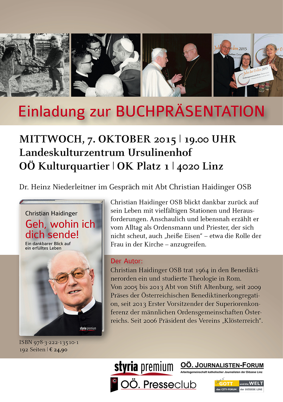 "Geh, wohin ich dich sende" - in seiner Autobiografie wirft Abtpräses Christian Haidinger, Vorsitzender der Superiorenkonferenz der männlichen Orden Österreichs, einen „dankbarer Blick auf ein erfülltes Leben“. Am 6. Oktober 2015 präsentiert Haidinger seine Autobiografie in der Buchhandlung Herder in Wien, am 7. Oktober 2015 im Landeskulturzentrum Ursulinenhof in Linz. Das Buch, das der Ordensmann als seinen ganz persönlichen Beitrag zum JAHR DER ORDEN betrachtet, ist seit Anfang September im Buchhandel erhältlich.