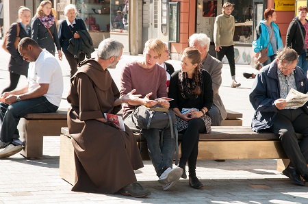 Das von Papst Franziskus ausgerufene „Jahr der Orden“ brachte die Tiroler Einrichtungen auf eine ungewöhnliche Idee. Bei prächtigem Herbstwetter startete die Rote Ordenscouch am 12. September mit ihrer Tour durch die Diözese Innsbruck. Mitglieder zahlreicher Tiroler Ordenseinrichtungen suchten in der Maria-Theresien-Straße mitten im Zentrum von Innsbruck das Gespräch mit den Passanten.