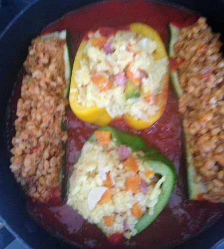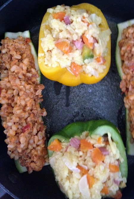 Fülle 2: Perlweisen nach Packungsanleitung garen, mit Sugo vermischen, Gemüse füllen. Gefülltes Gemüse anbraten, Tomatensauce zugeben. Im Rohr ca. 25 Min bei 200 Grad zugedeckt garen. Ca. 10 min. bei hoher Oberhitze bräunen.