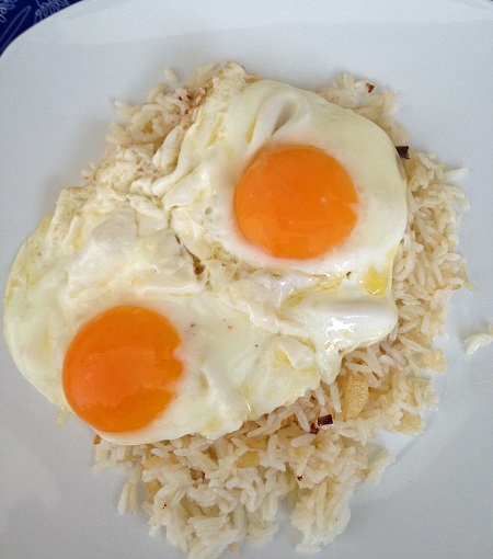 Knoblauch fein hacken, in Öl goldgelb anbraten, Reis zugeben und mitbraten; mit Sojasauce abschmecken. Spiegeleier braten.