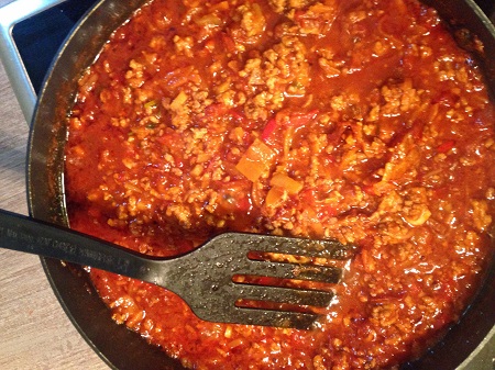 Zwiebeln, Knoblauch hacken; Karotten, Sellerie, Paprika in Streifen schneiden, Zwiebeln und Knoblauch goldgelb anrösten, Faschiertes mitrösten. Gemüse zugeben und mitrösten, Pelati zugeben und untermischen. Mit Wein und Suppe aufgießen, würzen. Auf kleiner Flamme mindestens eine Stunde köcheln lassen.