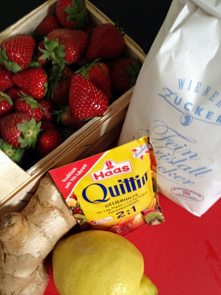 Erdbeeren putzen und zerkleinern, Früchte in Kochgeschirr geben, Gelierhilfe über die Beeren streuen und vermischen; Zitronensaft beigeben. Unter ständigem Rühren zum Kochen bringen, Zucker und Ingwer zugeben; nochmal 5 Minuten unter ständigem Rühren kochen. Möglichst heiß in Gläser abfüllen, 5 Minuten auf den Deckel stellen.