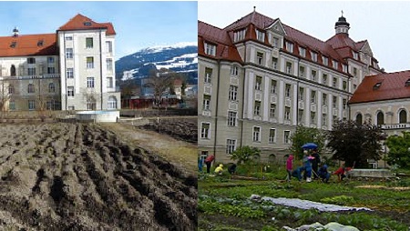 Vorher und nachher: im Projekt "Garteln im Kloster" öffnen die Haller Kreuzschwestern ihren Klostergarten für 23 Familien, um ihn gemeinsam wieder zum Blühen zu bringen.