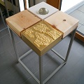 Das Objekt „HINGABE“, ein Tisch mit schachtelartiger Platte, der vier Elemente vereint und symbolisch das Kreuz der Kreuzschwestern bildet, ist eigens für die Ausstellung und den Kontext des Hauses entstanden. Ein Quader eröffnet die Assoziation mit einem Auge, in zwei weiteren Quadern schafft Zirbenholz eine Verbindung zur Natur und spricht als wohlriechender Werkstoff den Geruchssinn an. Dieser Naturbezug wird im vergoldeten vierten Teil des Objektes mit Rindensegmenten aufgenommen. Vielzählige Oberflächen, Materialien und Formen gibt es für interessierte Besucher also nicht nur zu bestaunen, sondern ausdrücklich auch mit den Händen zu erfahren, fühlen und begreifen.