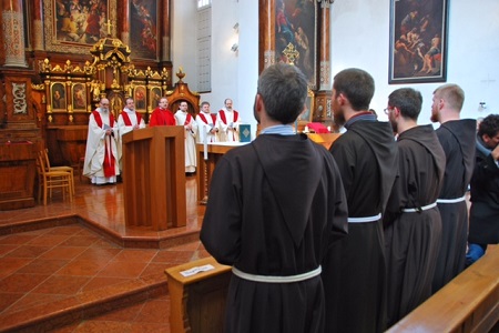 „Endlich…!“ so Br. Florian über sein Versprechen. „Nach eineinhalb Jahren Noviziat sind wir wieder einen Schritt weiter!“ Armut, Gehorsam und Ehelosigkeit – das haben er und seine Mitbrüder bei der Feier gelobt, vorerst auf drei Jahre, aber mit einem klaren Blick darüber hinaus. „Die Novizen bekennen mit diesem Schritt öffentlich, dass sie dieses Lebensmodell zu dem ihren machen wollen“, erklärt Br. Bernd Kober die Gelübde. Als Novizenmeister ist er Ausbildner des Ordensnachwuchses und hat die vier Männer nun über die letzten eineinhalb Jahre im „Noviziat“ unterrichtet und begleitet. „In der Zeit danach bis zu den ewigen Gelübden wachsen sie noch mehr in die Gemeinschaft hinein.“ Die Noviziatsausbildung findet für den ganzen deutschsprachigen Raum gemeinsam in Salzburg statt.