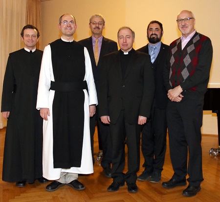 Foto (v.l.): Mag. P. Laurentius Resch, Prior des Benediktinerstiftes Seitenstetten; Prof. Dr. P. Pius Maurer, Prior des Zisterzienserstiftes Lilienfeld; Prof. Mag. Franz Reithner, musikalische Begleitung; Rektor DDr. Reinhard Knittel; Prof. Dr. Fritz Schipper, Koordinator der Veranstaltungsreihe; Mag. Richard List, Stv. Obmann des Katholischen Bildungswerks der Diözese St. Pölten.