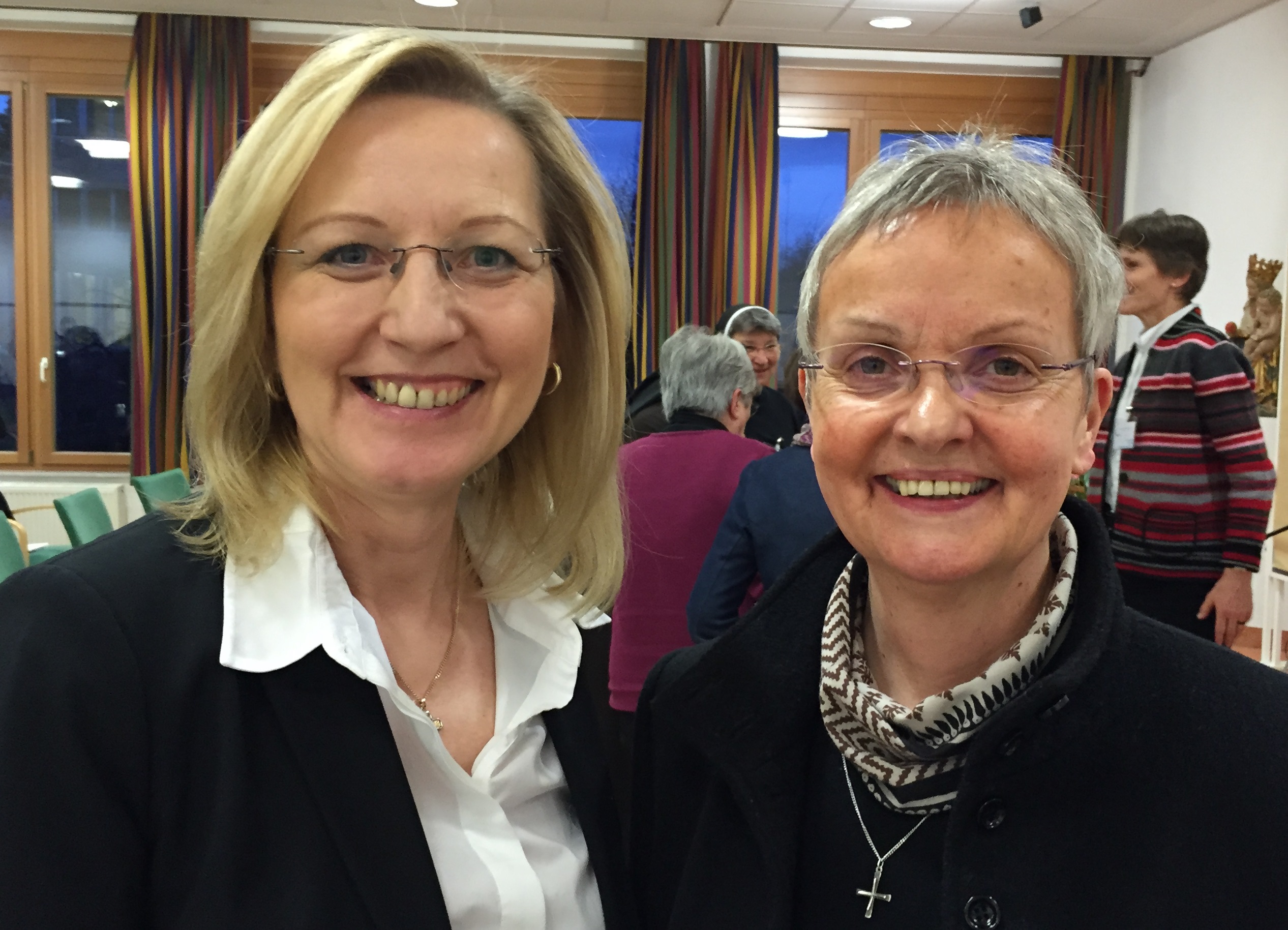Die Präsidentin Sr. Beatrix Mayrhofer stellt in ihrer Begrüßung in Anlehnung an Papst Franziskus als Wunsch an die Tagung, dass die Gemeinschaften und Institutionen zusammenwachsen, offen für Begegnung und Dialog sind und auf Augenhöhe zuhören: „Wenn wir das tun, werden wir wie der Papst es sagt, bewahrt von der Krankheit der Selbstbezogenheit.“ Die Referentinnen Sr. Edith Maria Magar von den Waldbreitbacher Franziskanerinnen und Eva Heigl von den Kreuzschwestern Europa Mitte wurden als „Agentinnen des Zuerst“ dem Plenum vorgestellt.