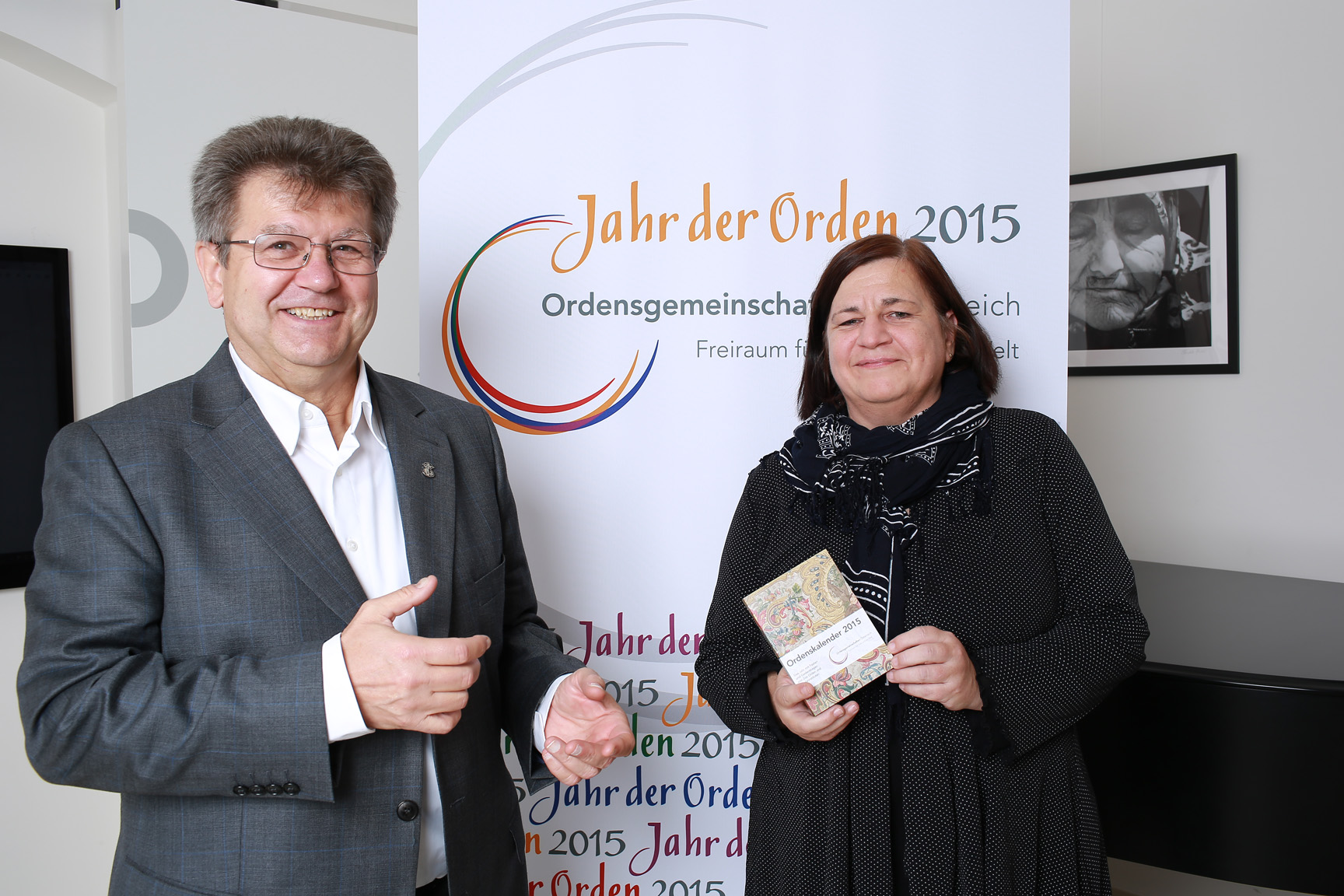 P. Erhard Rauch, Generalsekretär der Superiorenkonferenz der männlichen Ordensgemeinschaften Österreichs, und Dr. Helga Penz, Leiterin des Referates für die Kulturgüter der Orden, präsentieren den Ordenskalender 2015 (c) Kati Bruder
