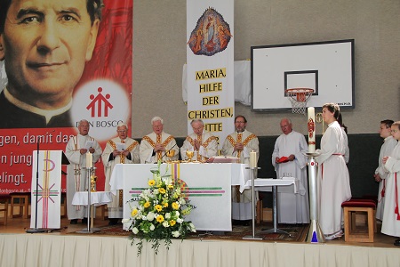 Den abschließenden Höhepunkt der 100-Jahr-Feiern bildete der Festgottesdienst am Sonntag, dem 27. April mit Erzbischof emer. Alois Kothgasser SDB. Bischof Kothgasser ist selbst ein ehemaliger Schüler des Don Bosco Gymnasiums. Von 100 Jahren Studienheim durfte er, wie er betonte, 60 Jahre mitgestalten. Hier wurde die Grundlage für seinen Dienst am Menschen geschaffen. Das Don Bosco Gymnasium ist nicht nur äußerlich in vielen Bauperioden gewachsen sondern auch durch die Anzahl der Schüler. Im Sinne Don Boscos: „Wer die Jugend hat, hat die Zukunft; wer die Zukunft hat, hat die Jugend“ werden heute im Don Bosco Gymnasium die Schülerinnen und Schüler unterrichtet. Der Erzbischof betonte am Ende der Predigt, was die Schule auszeichnet, nämlich den jungen Menschen Liebe und Geborgenheit zu schenken, beziehungsweise zu helfen, dass das Leben gelingt. Für diese Anliegen hat sich auch der plötzlich verstorbene Direktor des Hauses, Pater Franz Wöß SDB, sehr engagiert.