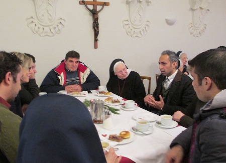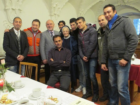 Das Kloster Wernberg lud im Rahmen der „Herbergssuche 2013“ stellvertretend 30 Flüchtlinge ein, um mehr über ihr Schicksal und ihr Leben auf der Flucht zu erfahren. Bei Kaffee und Kuchen der KFB Frauen mit Sr. Daniele und Raissas Piroschki ergaben sich rasch interessante Gespräche. Auch Bürgermeister Franz Zwölbar zeigte sich an einem guten Zusammenleben mit den Bewohnern des Wernberger Flüchtlingsheimes interessiert. Da Asylwerber nach den gesetzlichen Möglichkeiten bei der Kommune mitarbeiten dürfen, sprach Bürgermeister Zwölbar beim Gruppenfoto scherzhaft von einem „Mitarbeitertreffen“.