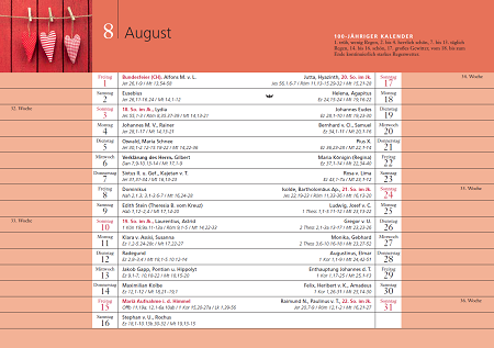Mehr Kalendarien: Monatskalendarium mit Namenstagen, Tageslesungen und Platz für Notizen; Jahreskalender zum Heraustrennen, Mondkalender und Vorschaukalender für 2015, das alles ist in einem Heft beisammen. Die praktische Flappe zum Einlegen ermöglicht es, den jeweiligen Monat sofort zur Hand zu haben.