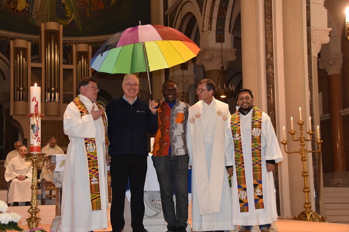 Der neue Provinzrat bekam vom bisherigen Provinzial P. Stephan Dähler einen Regenschirm in Regenbogenfarben überreicht. (c) SVD