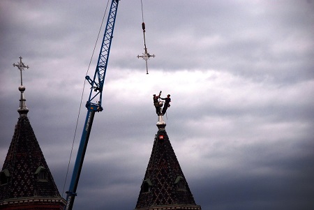In schwindelerregender Höhe turnten am 29. Oktober 2013 Arbeiter auf den Turmspitzen der Hl. Geist Kirche von St. Gabriel herum und setzten zwei neue Kreuze auf. Nach fast 100 Jahren waren die alten Kreuze verrostet und der Kirchturmdachstuhl verfault. Eine gründliche Renovierung war dringend notwendig.