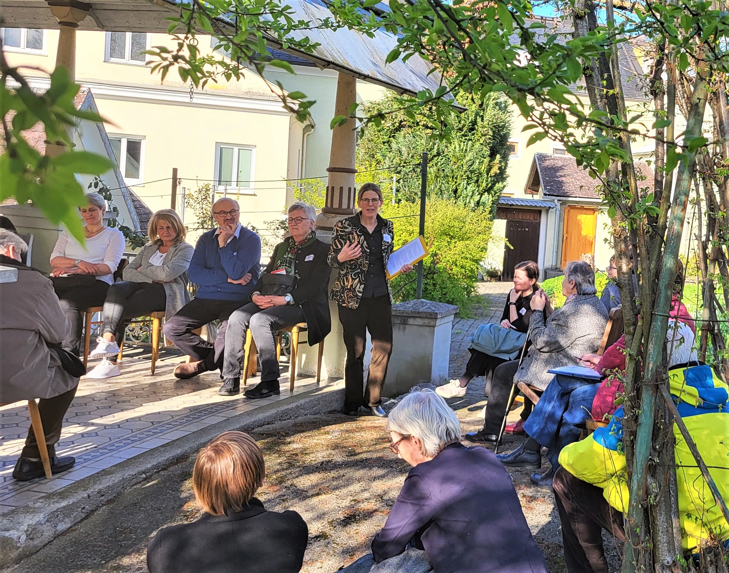 Nach der Begrüßung durch Karin Mayer und einer kurzen Einführung zur Spiritualität des Veranstaltungsortes widmete sich Sr. Ruth Pucher MC dem spannenden Thema „Kirche entdecken – Anliegen der Kirchenpädagogik“. Aufgrund des strahlenden Wetters fand dieser Programmpunkt kurzerhand im Klostergarten des Karmelitinnenklosters statt. Die Leiterin der ARGE Kirchenpädagogik der Österreichischen Ordenskonferenz appellierte in ihrem Vortrag voller Leidenschaft: „Bringen Sie Mensch und Kirchenraum in Beziehung!“ Welche Möglichkeiten es dazu gibt, erläuterte sie anhand von acht Thesen, die der Bundesverband für Kirchenpädagogik in Deutschland dazu erarbeitet hat und seit vielen Jahren erfolgreich in der Vermittlungsarbeit anwendet. Alle Punkte laufen darauf hinaus, dass der Sinngehalt einer Kirche mit Kopf, Herz und Hand erschlossen werden kann. Abseits der nüchternen Fakten ist es wichtig, Inhalte des christlichen Glaubens zeitgemäß zu vermitteln und einen Zugang zu spirituellen Dimensionen zu ermöglichen.