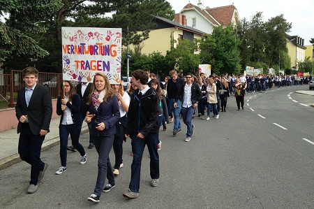 Die Seele der heutigen Aktion am Mauer Hauptplatz war Sr. Maria Elisabeth Göttlicher von den Ursulinen. „Der Maurer Hauptplatz hat schon viel gesehen, aber so eine Demonstration durch die Jugend von St. Ursula sicher schon lange nicht mehr!“, freut sich Sr. Elisabeth Göttlicher über die gute Stimmung am Maurer Hauptplatz. Der Öko-Rap von tausend Kindern und Jugendlichen war ein Höhepunkt neben kurzen Ansprachen von Sr. Elisabeth Göttlicher, die auch Obfrau des Schulvereins St. Ursula ist, und von Schülerinnen und Schülern. „Kirche – das ist nicht nur das Gebäude hier in der Nähe des Maurer Hauptplatzes“, erklärte Sr. Elisabeth Göttlicher in ihrer Rede. „Kirche, das sind die Menschen! Menschen, die sich nicht nur durch Augen-, Haar- und Hautfarbe unterscheiden, sondern Gott sei Dank auch in ihrem Charakter, in ihrem Wesen.“ Sie erinnerte an den Anlass, 50 Jahre Zweites Vatikanum. „Dieses große Ereignis ist eine Grundlage für unser Wirken mitten in der Gesellschaft, für die Möglichkeit, unsere Schulgemeinschaft offen zu leben für Menschen verschiedener Weltanschauungen und Glaubensgeschichten.“