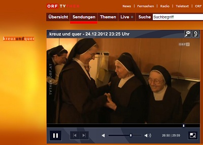 Die Marienschwestern vom Karmel in Linz haben dem Kreu&Quer-Team die Pforten geöffnet. "Weihnachten im Kloster" für den 24. Dezember 2012 kam so zustande. Im Einleitungstext heißt es: "Alle Jahre wieder geht es ab spätestens Mitte November los mit dem großen Weihnachtstrubel. Von der besinnlichen Vorbereitungszeit auf Weihnachten ist oft nichts mehr zu spüren. Dennoch scheint die Sehnsucht nach Stille in der Weihnachtszeit groß zu sein. Das Mutterhaus der Marienschwestern vom Karmel mitten in der Stadt Linz gelegen ist ein Hort der Stille. Die Marienschwestern, die die große kontemplative Spiritualität der Karmelitinnen mit dem tätigen Dienst am Menschen in den klostereigenen Kneipp-Kurhäusern verbinden, haben vor 10 Jahren ganz bewusst die Tore ihres Klosters am Weihnachtsabend für Außenstehende geöffnet. Das Angebot, „Weihnachten im Kloster“ wird seitdem vermehrt von Menschen, die Ruhe, Stille und Einkehr suchen, in Anspruch genommen. Eine Reportage aus dem Mutterhaus der Marienschwestern vom Karmel zur Weihnachtszeit."