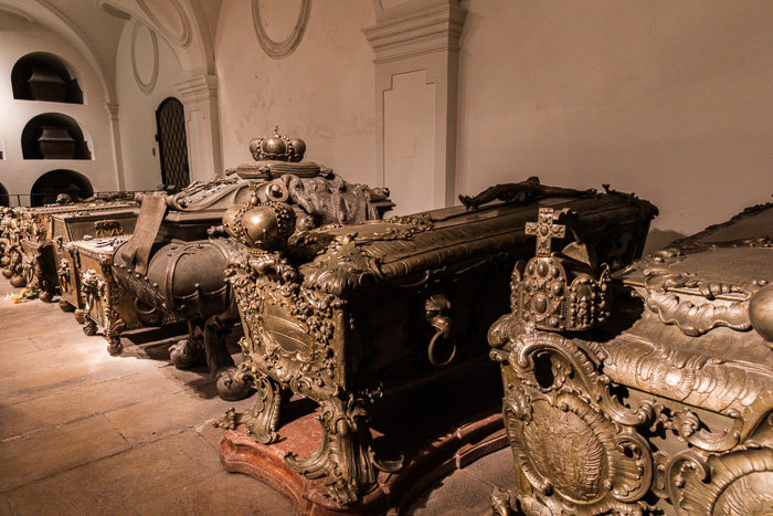 Beim Rundgang betrachte ich die Särge näher. Die Materialen haben sich im Laufe der Zeit geändert, erfahre ich. Von Blei über Zinn und Bronze bis hin zum Kupfersarg. Auch das Design spricht über die Jahrhunderte hinweg je eine andere Sprache: Von den schlichteren Särgen der Spätrenaissance über die formen- und symbolreichen Särge des Spätbarocks und Rokoko bis hin zu den josephinischen Sarkophagen mit klarer Struktur. Särge sprechen die Sprache ihrer Zeit.