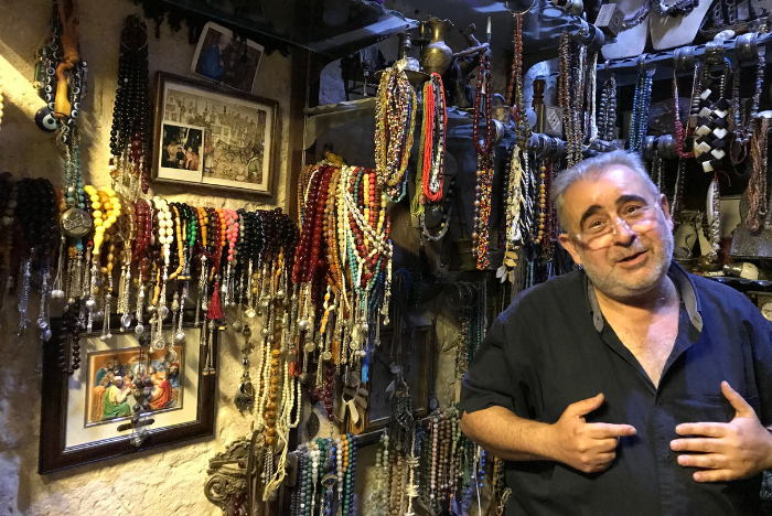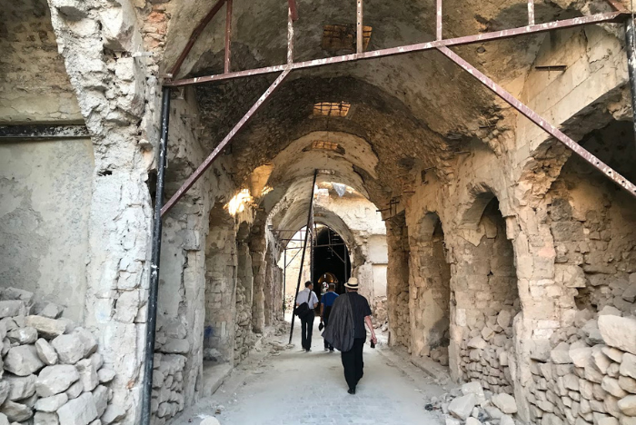 Ein Rundgang durch den weltweit größten, 12 km langen und 350 Hektar großen, überdachten Souk offenbart die komplette Bandbreite der Zerstörung. Die ehemals farbenfrohen Geschäfte sind nur noch Ruinen, Löcher in den Wänden, alles ist zerstört, tot. Obwohl keine Kunden vorbeikommen, hat Youssef, ein etwa 50-jähriger Mann von rundlicher Statur, sein Geschäft geöffnet, ein kleiner Laden von rund zwei Quadratmetern. Er verkauft alte Stoffe aus Aleppo, Schmuck und Nippes. Wie es ihm geht? Der freundliche Mann zeigt auf die Fotos von vier jungen Männern auf seinem Smartphone und sagt mit Tränen in den Augen: „Ich bin in Aleppo geboren, ich war immer hier. Jetzt ist das Leben sehr schwer. Ich habe vier Söhne, jedem habe ich vor dem Krieg ein Geschäft gekauft.“ Er deutet auf die vier Löcher in der Wand gegenüber. „Ich bin ich mit meinen Söhnen nur noch über WhatsApp in Kontakt. Ich habe sie seit sechs Jahren nicht mehr gesehen, sie arbeiten heute in Istanbul in Restaurants.“