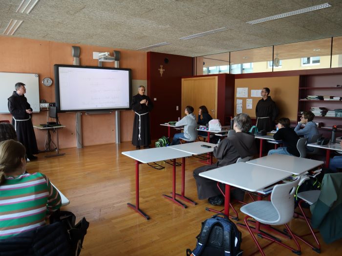 Generalminister P. Massimo Fusarelli diskutiert mit Schülern am Franziskanergymnasium in Hall i. Tirol. (c) ofm