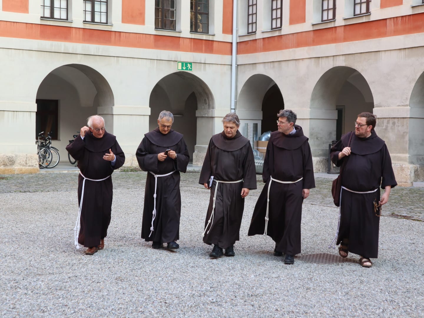V..l.n.r.: P. Willibald Hopfgartner, P. Massimo Fusarelli, P. Fritz Wenigwieser, P. Albert Schmucki, Br. Christoph Maria Hörtner im Innenhof des Grazer Priesterseminars..ofm/Br. Martin Barmettler