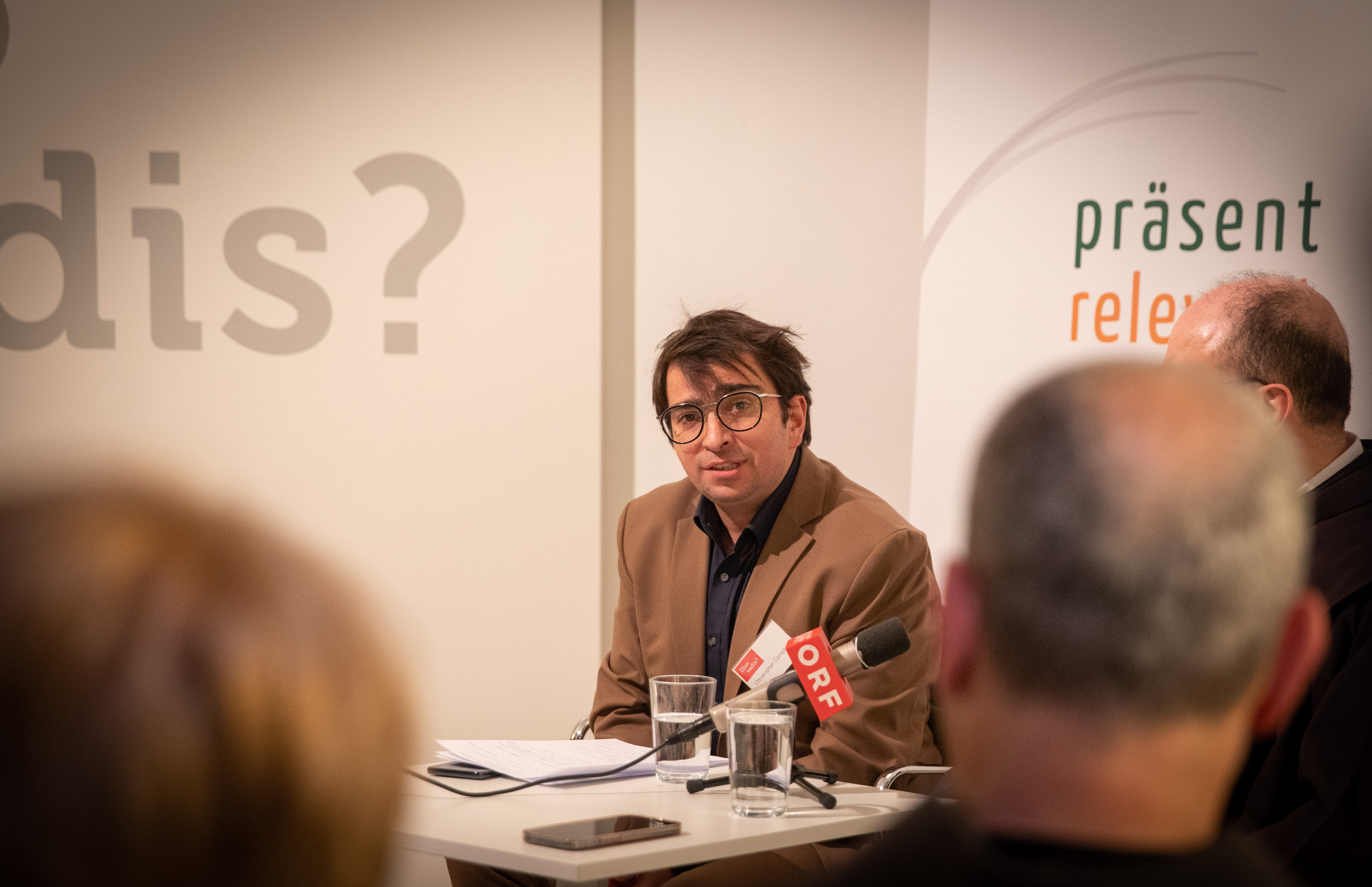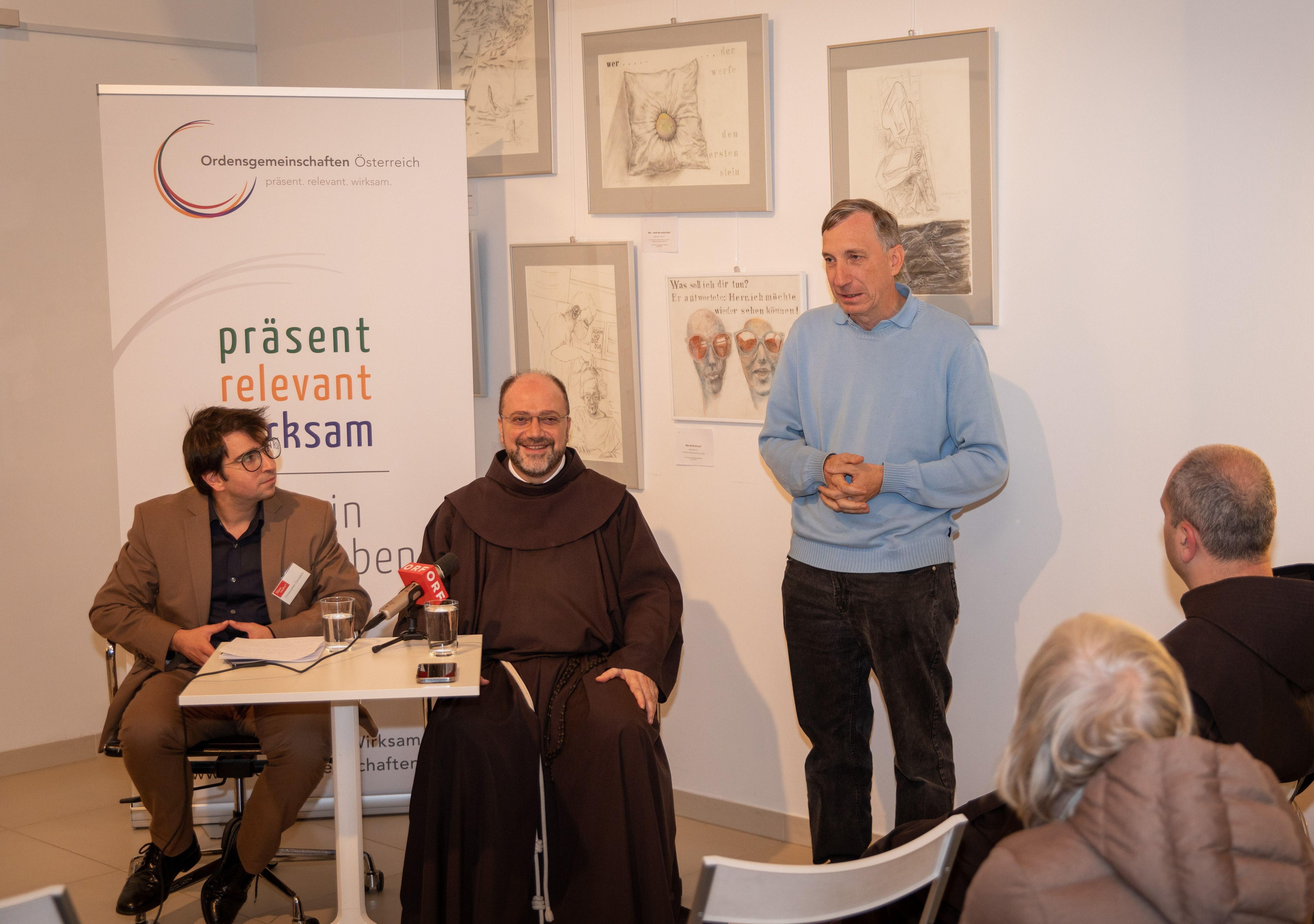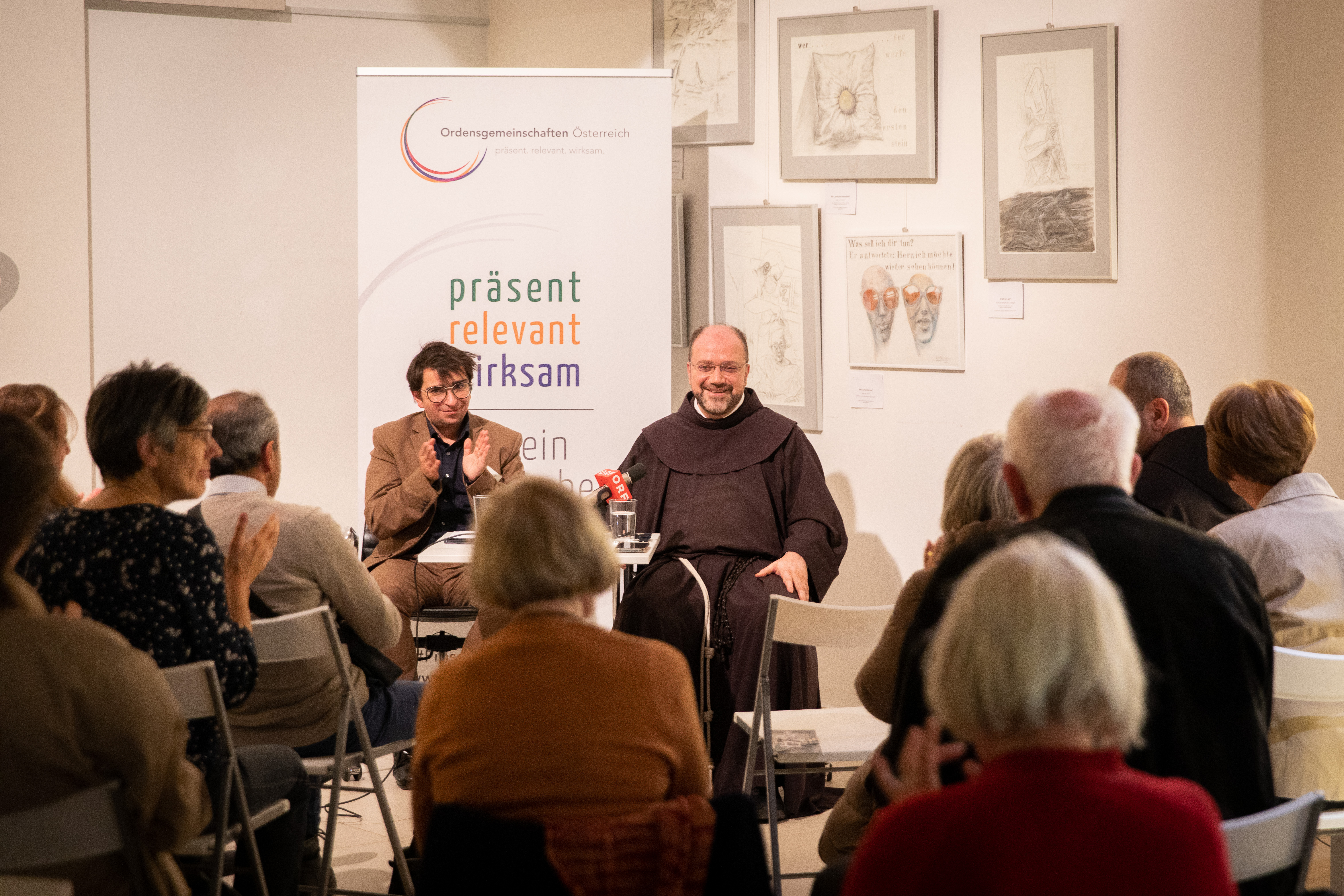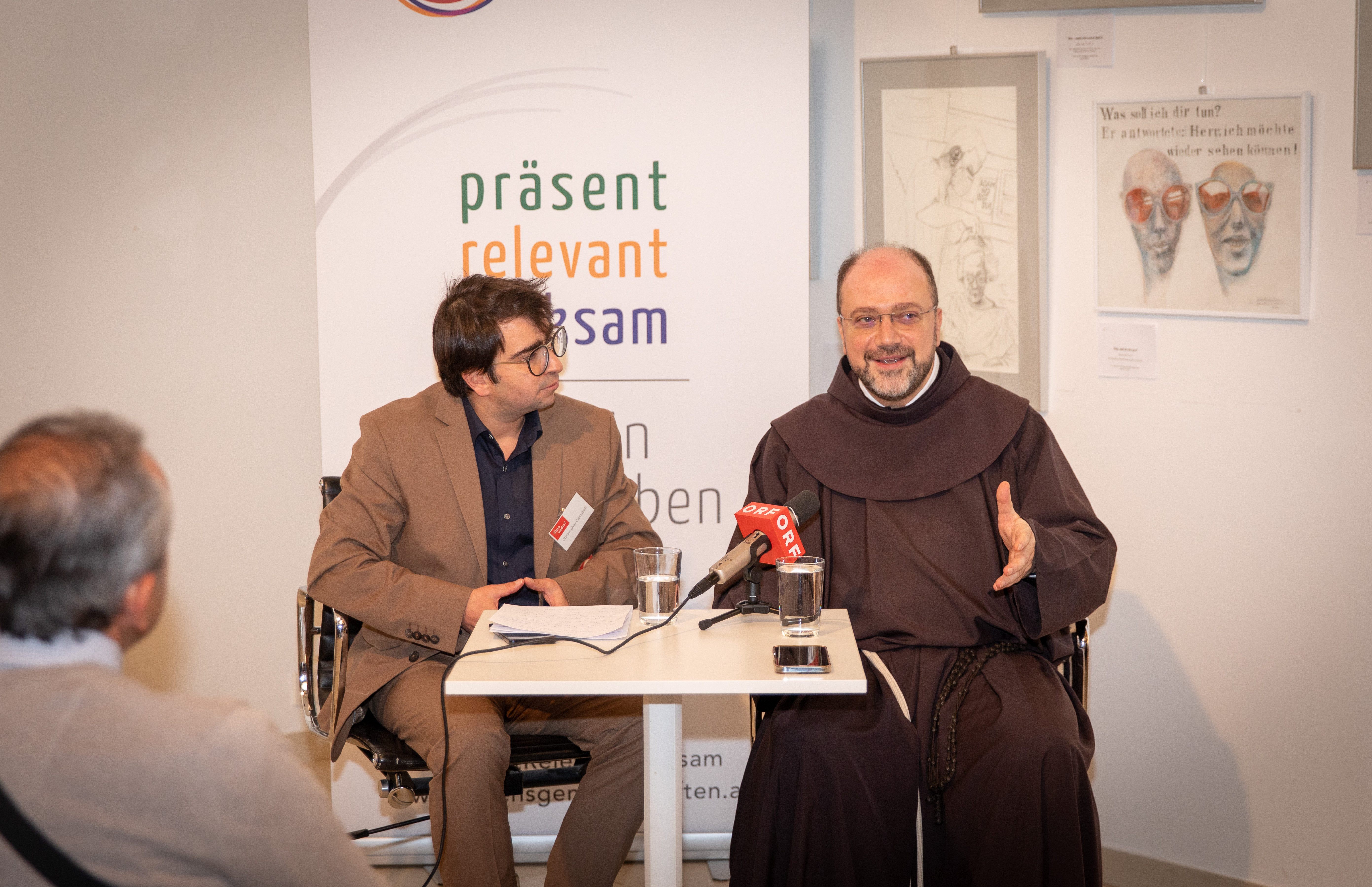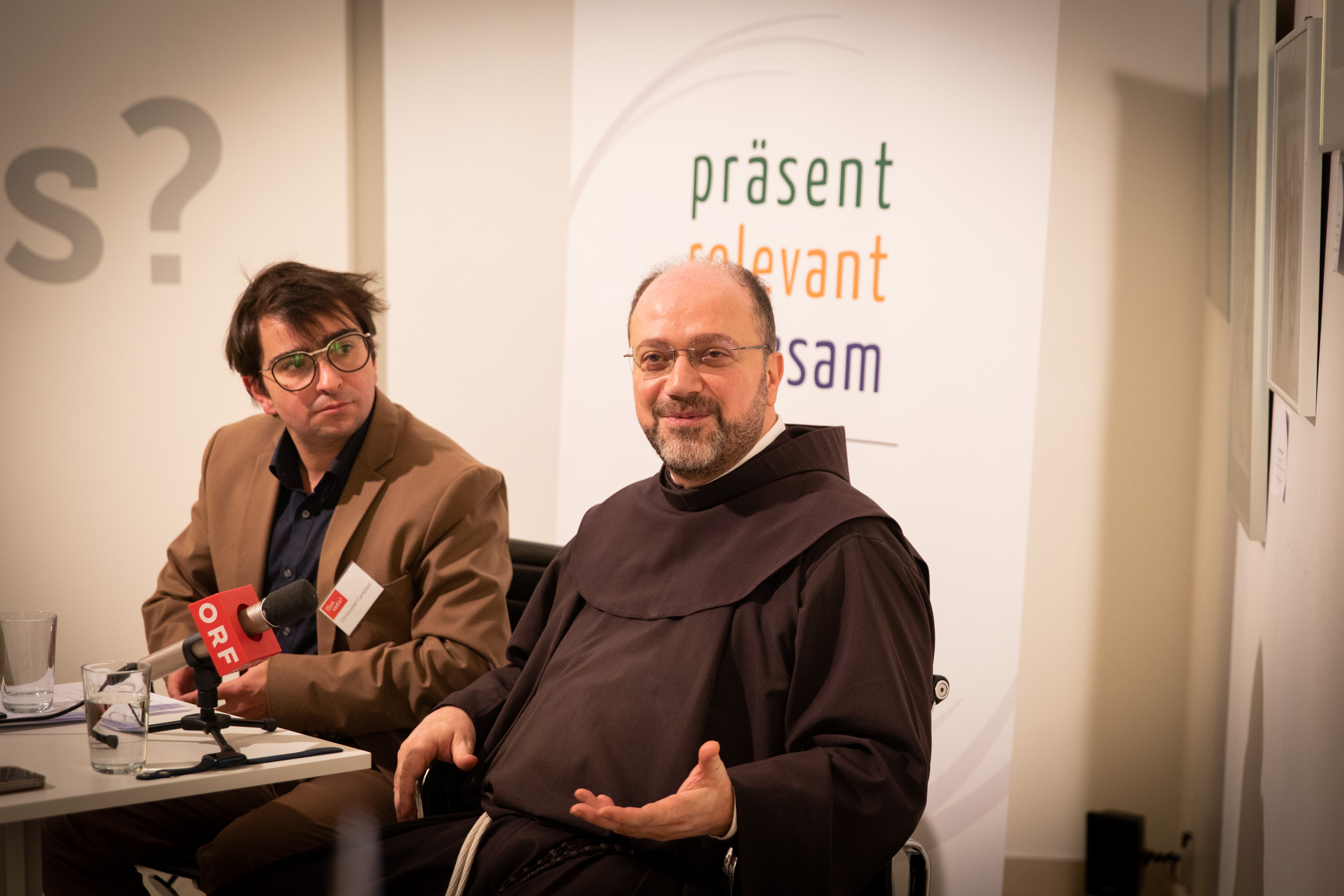 P. Ibrahim Alsabagh kam auf Einladung von der Initiative Christlicher Orient nach Österreich. Projektkoordinator Stefan Maier (links) stellte ihn den Gästen im Quo vadis? vor. (c) Elisabeth Mayr-Wimmer | Download