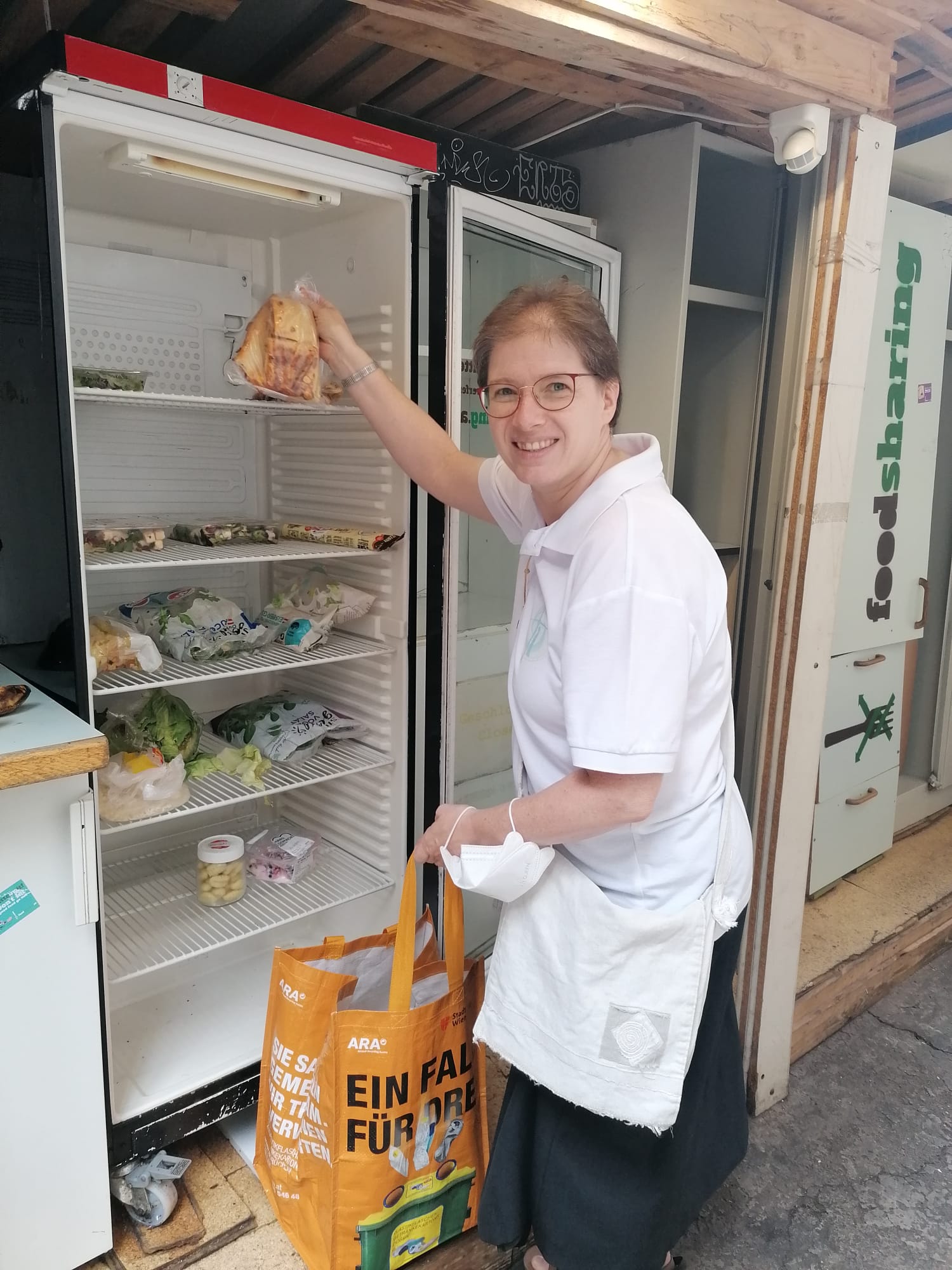 Sr. Elisabeth Knapp von den Franziskanischen Schwestern von der Schmerzhaften Mutter in Wien Simmering bringt übrig gebliebenen Speisen aus dem Kindergarten in den foodsharing-Fairteiler. (c) SSM Download