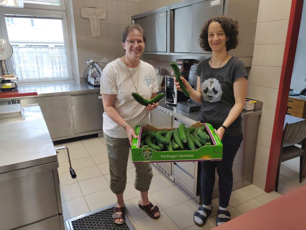 Krumm, und trotzdem gut: Seit bestehen des Klosters (130 Jahre) ist es es Brauch, dass die Franziskanischen Schwestern von der Schmerzhaften Mutter in Wien Simmering von den Gärtnereien Gemüse bekommen, "das nicht perfekt" ist. Hier im Bild: Sr. Elisabeth Knapp und Postulantin Jana Roschitz mit den krummen Gurken. (c) SSM Download