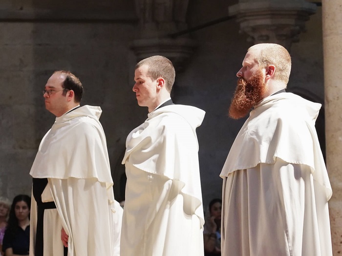 Pater Eugenius Felix Lersch, Pater Leo Hector De Andrés Brunete und Pater Niklaus Lukas Schneider (v.l.n.r.) bei ihrer Feierlichen Profess im Stift Heiligenkreuz. (c) Stift Heiligenkreuz/Elisabeth Fürst