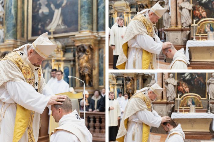 Dreifachen Grund zur Freude hatten die Dominikaner am 20. Mai 2023. Gleich drei Fratres wurden in der Wiener Dominikanerkirche S. Maria Rotunda durch Kardinal Christoph Schönborn zu Priestern geweiht. Zahlreiche Wegbegleiter:innen der Weihekandidaten Gabriel Jordan Theis, Simon Hacker und Lucas Leonhard Wieshuber nahmen an der Zeremonie teil.