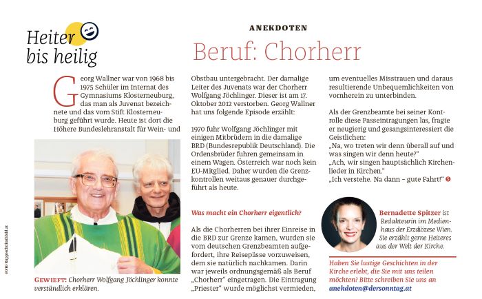 Bernadette Spitzer vom Medienhaus der Erzdiözese Wien sammelt für die Wiener Kirchenzeitung „Der SONNTAG“, sowie für ein Buch Anekdoten aus der Welt der Kirche. Sie freut sich über lustige, eindrucksvolle, bemerkenswerte Erlebnisse von Ihnen.