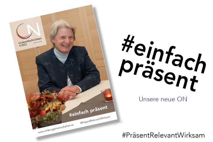 „Papst Franziskus ermutigt uns, ‚die Gegenwart mit Leidenschaft zu leben‘, schreibt Sr. Franziska Bruckner, stellvertretende Vorsitzende der Österreichischen Ordenskonferenz, im Vorwort der ON 4/22. "Denn das Wesentliche ereignet sich im Augenblick, in der Begegnung und in der gelebten Beziehung.“ In dieser Ausgabe der ON erzählen uns einige Ordensleute, was für sie „einfach präsent“ sein bedeutet.