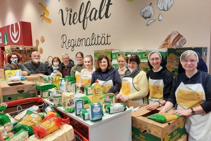 Unter dem Motto "Kaufe mehr & schenke es her" baten die Amstettner Franziskanerinnen am 4. und 5. März um Spenden aus dem Interspar in Amstetten. Das überwältigende Ergebnis: 355 Bananen-Schachteln voller Lebensmitteln und Windeln, die jetzt über die Hilfsorganisation "ORA International" in die Ukraine gebracht werden.