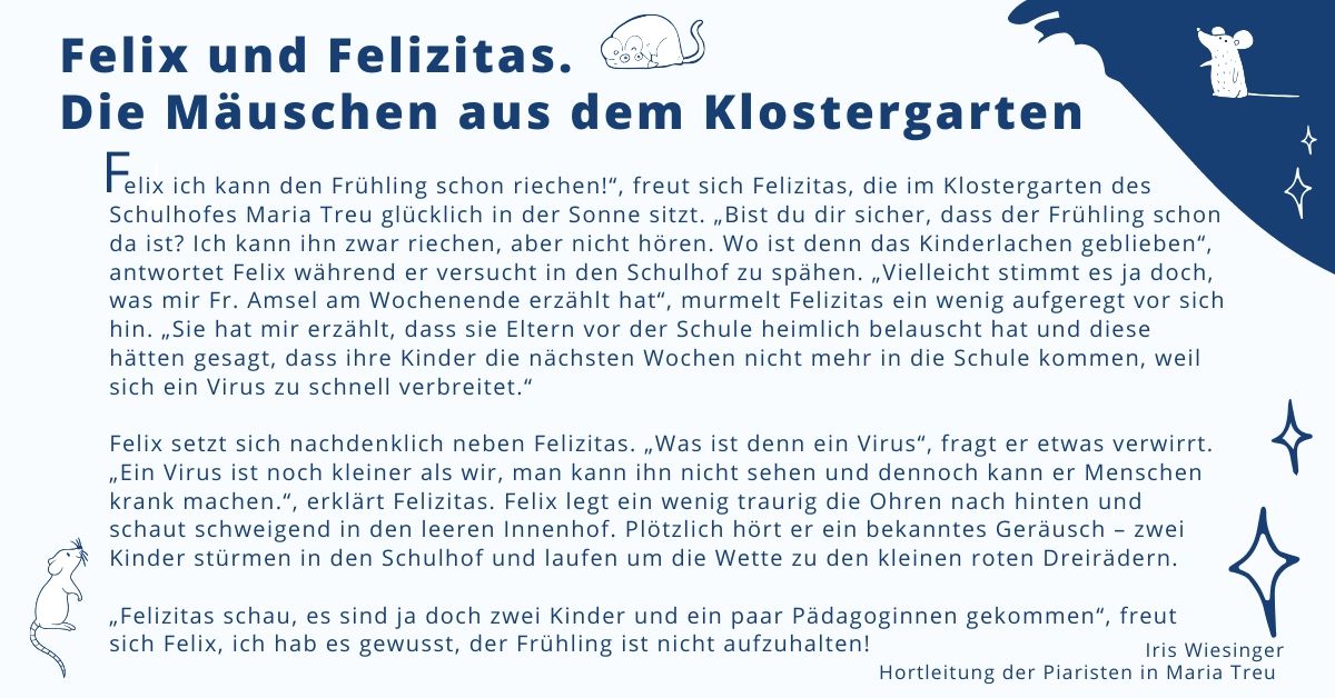 Unsere Mutbotschaft heute ist ein Märchen für die Kleinen: Zwei Mäuse sitzen im Klostergarten in der Sonne und wundern sich: wo sind eigentlich die ganzen Kinder?