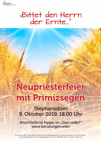 Am 9. Oktober 2019 um 18.00 Uhr findet im Stephansdom der Dankgottesdienst für die Priesterberufungen des heurigen Weihejahrgangs statt. Großer Dank gilt dabei auch den vielen Ordensgemeinschaften, die mit ihren finanziellen Beiträgen die Priesterseminaristen während ihres Studiums unterstützt haben. Auch die heuer geweihten Ordenspriester, deren Gemeinschaften im Bereich der Erzdiözese Wien liegen, oder die nach ihrer Weihe in eine Niederlassung in Wien gewechselt sind, werden erwartet. Alle Ordensfrauen und -männer sind herzlich zur Mitfeier und anschließenden Agape ins Begegnungszentrum der Orden, das Quo Vadis? am Stephansplatz, eingeladen.