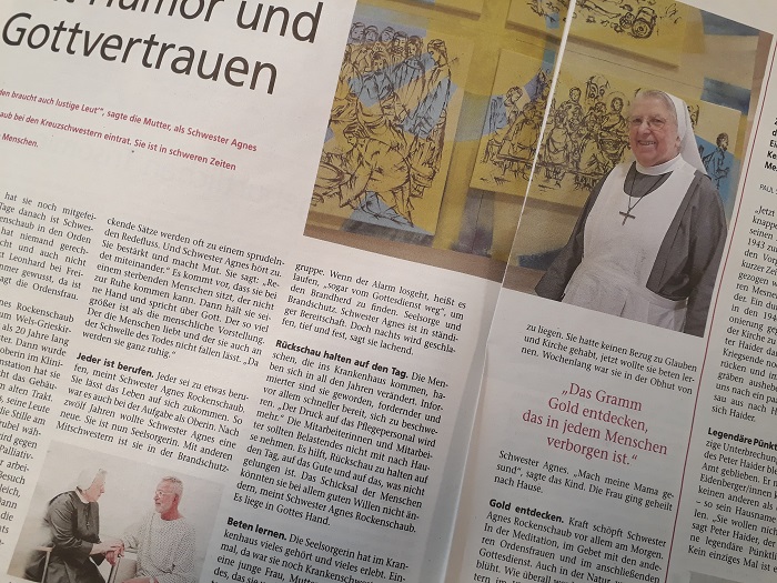 In der Ausgabe (Nr. 12) vom 21. März 2019 porträtiert die Kirchenzeitung der Diözese Linz Sr. Agnes Rockenschaub von den Kreuzschwestern in Wels. Dort arbeitete sie am Klinikum Wels-Grieskirchen 20 Jahre lang als Krankenschwester, ehe sie Konventoberin und letztendlich Krankenhausseelsorgerin wurde. "Ich merke gleich, ob jemand ein Gespräch braucht", sagt die Ordensfrau im Interview.
