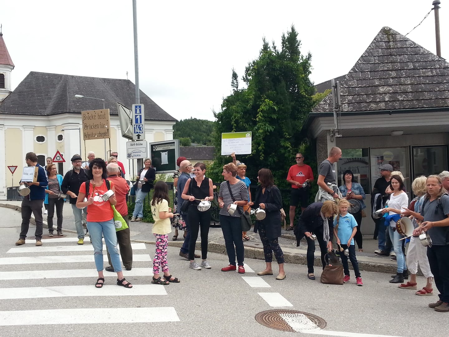 Auf Facebook verteilten sich diese Bilder in Windeseile und lenken so auch online das Licht auf eine Unterstützungsaktion der Franziskanerinnen von Vöcklabruck. Alle Schwestern stellten sich gemeinsam mit rund 100 Anwohnerinnen auf die Brücke vor dem Restaurant Cafe "Zur Brücke" um sich gemeinsam mit Kochlöffeln und Töpfen gegen die Schließung dieses sozialökonomischen Beschäftigungsprojekts für Langzeitarbeitslose zu solidarisieren. Sr. Angelika Garstenauer, Generaloberin, macht deutlich : "Wir wollten uns dafür einsetzen, dass die Brücke erhalten bleibt! Uns machen die Kürzungen im Sozialbereich große Sorgen, auch deshalb war es uns ein Anliegen, unsere Solidarität mit einem so konkreten Sozialprojekt zu zeigen!"