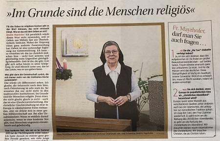 In der "Presse am Sonntag" nimmt Präsidentin Sr. Beatrix Mayrhofer unter "Letzte Fragen" gegenüber Duygu Özkan Stellung zum Geben im religiösen Kontext, zur Not heute, zu Flüchtlingen, zu Ordensschulen, #Metoo und "dass islamische Quellen zur europäischen Tradition gehören".
