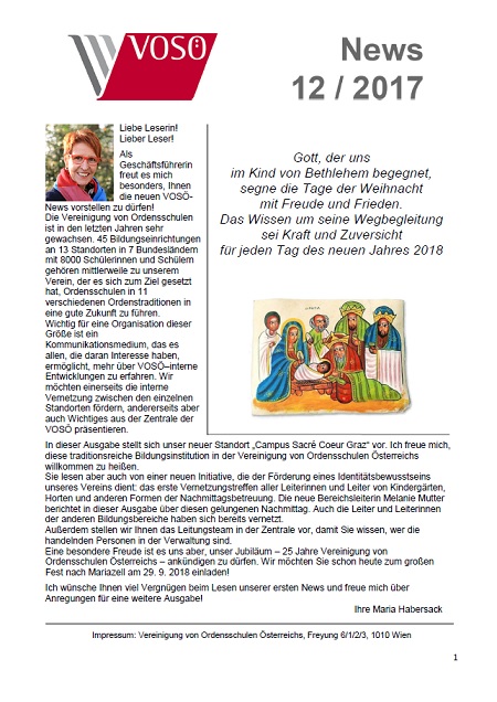 Die Vereinigung von Ordensschulen Österreichs hat eine Premiere zu berichten: Am 14. Dezember 2017 erschien zum ersten Mal die "VOSÖ-News", die in Form eines digitalen Newsletters Aktuelles und Neuigkeiten aus den Ordensschulen in konzentrierter Form publizieren.