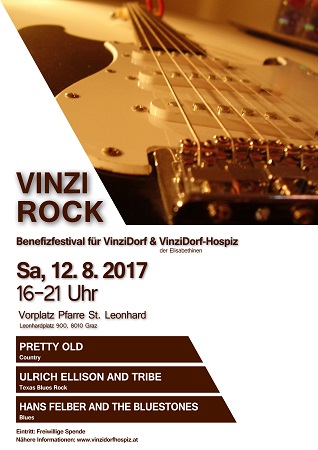 Alkoholkranken Männern ohne Obdach bietet das VinziDorf eine neue Heimat. Obdachlose Menschen, die sterbenskrank sind, können ihr Leben im VinziDorf-Hospiz der Elisabethinen vollenden. Für sie alle spielen internationale Rockmusiker am Samstag, dem 12. August 2017 ab 16 Uhr am Areal der Pfarre St. Leonhard/Graz ein Benefizfestival.