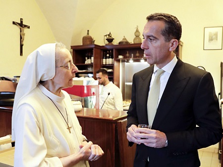 Im Rahmen seiner Nahostreise besuchte Bundeskanzler Christian Kern am 24. April 2017 das Österreichische Hospiz in der Via Dolorosa in Jerusalem. Begrüßt wurde der österreichische Regierungschef von Hospiz-Rektor Markus Bugnyar und Vizerektorin Sr. Bernadette Schwarz. Die Kreuzschwester ist seit 2008 verantwortlich für die hauswirtschaftliche Leitung und seit 2011 Vize-Rektorin des Österreichischen Hospizes zur Heiligen Familie. Sr. Bernadette und Rektor Bugnyar führten den Bundeskanzler durch das historische Gebäude im Herzen der Jerusalemer Altstadt.