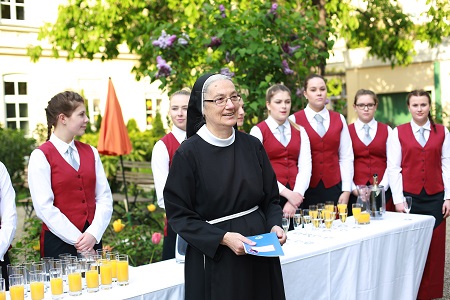 Im runden, ruhigen Innenhof und Garten der Schulschwestern vom 3. Orden des hl. Franziskus in der Apostelgasse in Wien Erdberg wurden die MedienvertreterInnen am 25. April 2017 zum Medienempfang der Ordensgemeinschaften Österreich begrüßt. Alles überragend: ein 150 Jahre alter, ausladender Kastanienbaum. An ihm wurde deutlich, worauf es den Schwestern, den Verantwortlichen des Schulvereins, den LehrerInnen und Lehrern ankommt: dass junge Menschen sich stark im Leben verwurzeln und sich nach oben ausrichten. Unter dem Thema „Räume erspüren“ waren die Journalistinnen und Journalisten zur Begegnung mit den Ordensfrauen und mit SchülerInnen und Schülern der HLW eingeladen.