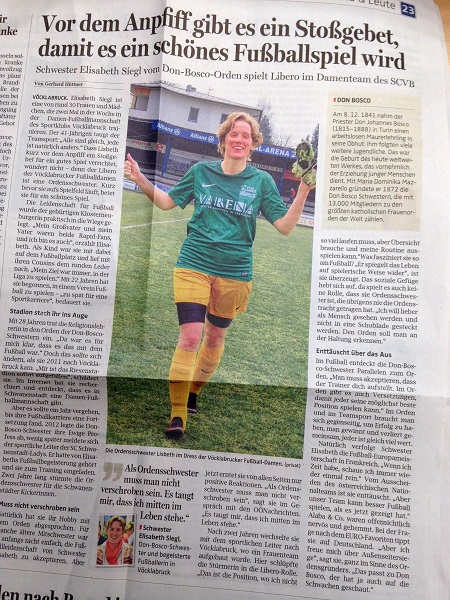 Elisabeth Siegl ist Fußballerin und Don Bosco Schwester. Das Spiel im Team verbindet für sie Ordensleben und Mannschaftssport. „Als Ordensschwester muss man nicht verschroben sein“, erklärt sie in den Oberösterreichischen Nachrichten.