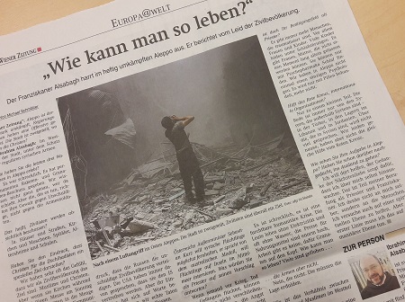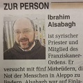 In der Ausgabe vom 8. Juni 2016 der Wiener Zeitung berichtet P. Ibrahim Alsabagh, Priester und Mitglied des Franziskanerordens, über die Not der Zivilbevölkerung in der nordsyrischen Stadt Aleppo. Sein Resümee: Der Bürgerkrieg in Syrien ist mittlerweile ein internationaler Krieg, der auch eine internationale Lösung braucht.