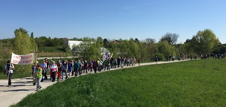 Weit über 100 Frauen und Männer haben die 24 Kilometer der „Wallfahrt in Solidarität mit Flüchtlingen“ am 26. April 2015 zu Fuß von Schwechat nach Maria Enzersdorf entlang von „Orten der Solidarität“ zurückgelegt. Die Generalleiterin der CS-Schwestern Susanne Krendlesberger und Abtpräses Christian Haidinger feierten mit den WallfahrerInnen zum Abschluß das „Politische Abendgebet“.