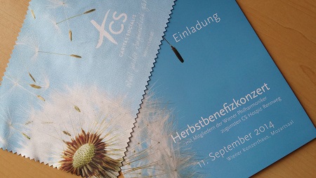 Das Hospiz Rennweg der Caritas Socialis lädt mittels eines Brillenputztuches zum Herbstbenefizkonzert am 11. September 2014 im Mozartsaal des Wiener Konzerthauses ein. Unter dem Motto "Weil jeder Augenblick zählt" werden an diesem Konzertabend Mitglieder der Wiener Philharmoniker zugunsten schwerkranker Menschen konzertieren.