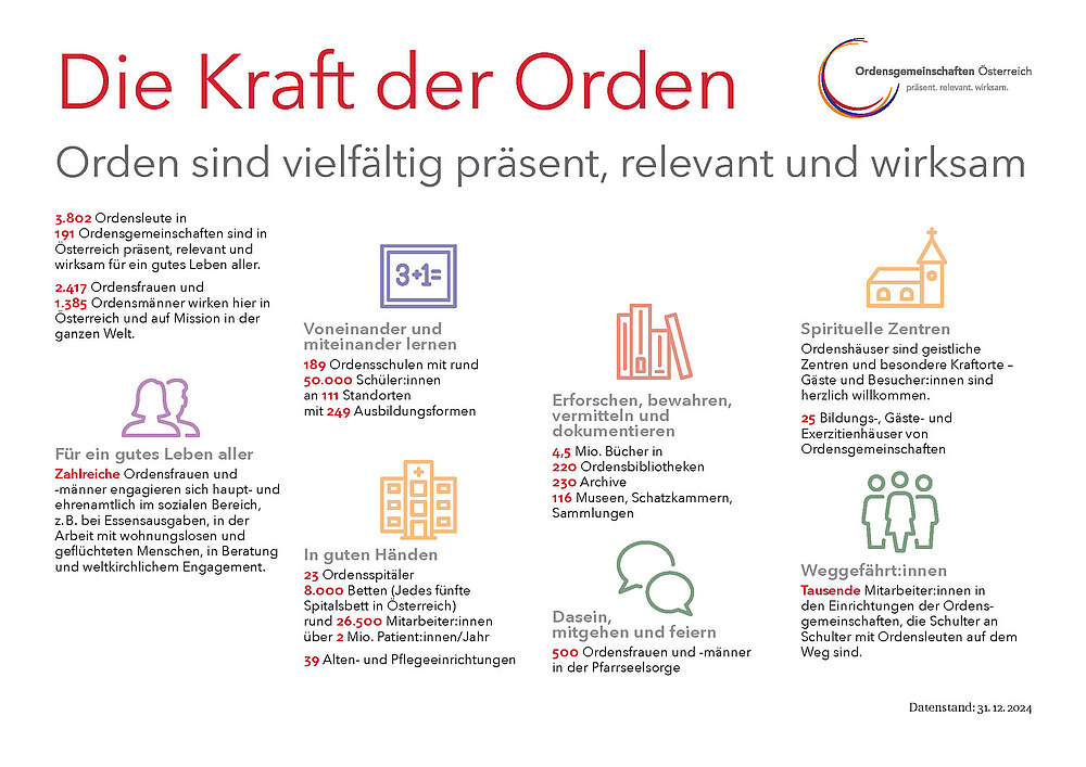 Rund 50.000 Schüler:innen besuchen die 189 Ordensschulen in Österreich. Sie werden dort umfassend gebildet und befähigt, ein gutes und eigenständiges Leben zu führen und auch soziale Verantwortung zu übernehmen. In ihrem Dasein in der Seelsorge, der Bildungs- und Wertearbeit und den pastoralen Anlaufstellen sind Ordensleute direkt bei den Menschen. Ordensfrauen und -männer in klausurierten Orden sind für Gott und die Welt in einer besonderen Weise in einem Rhythmus von Gebet und Arbeit da.
