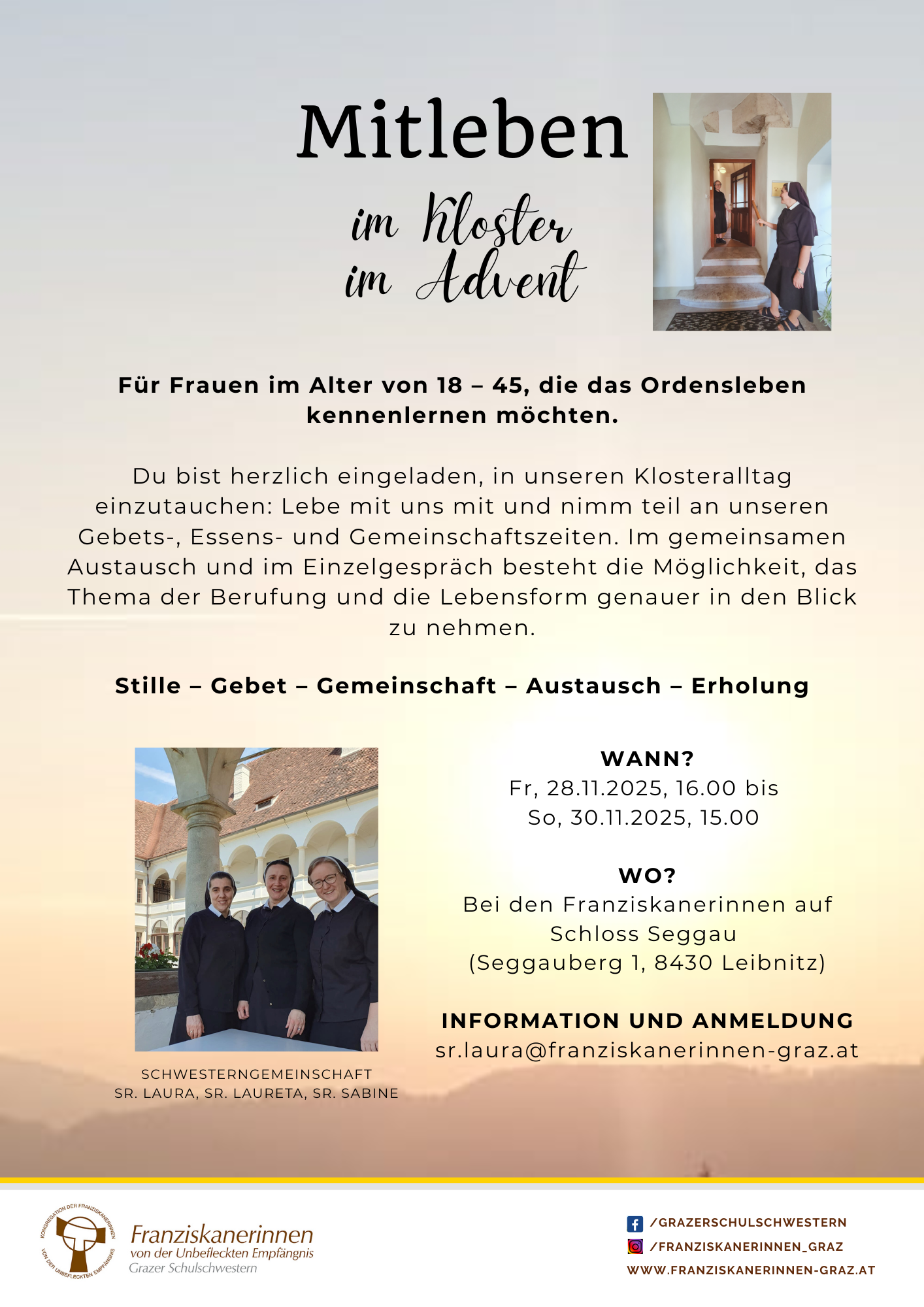 Die Grazer Schulschwestern laden alle interessierten Frauen herzlich ein, ein Wochenende lang in das Klosterleben einzutauchen und den Advent bewusst im Miteinander zu beginnen – in Stille, Gebet und Gemeinschaft.