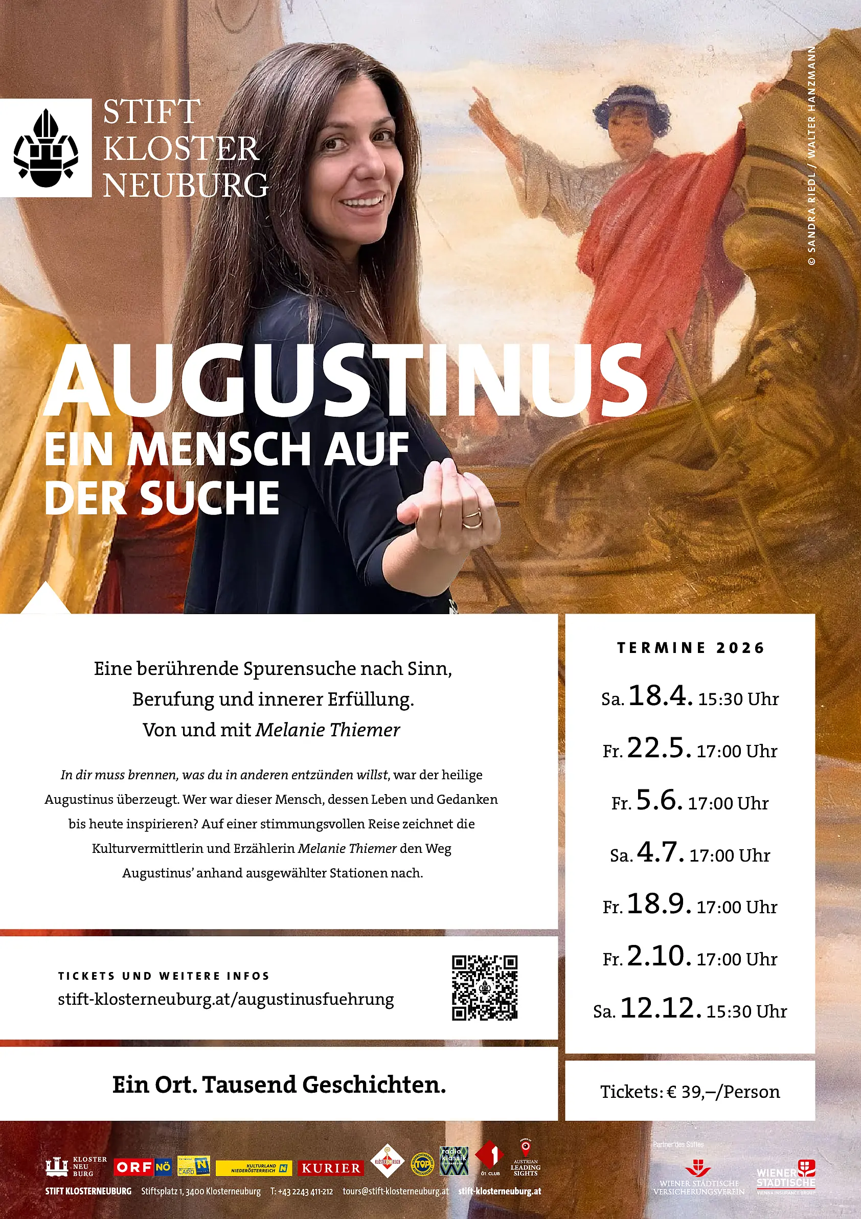Die Stationen der Führung sind bewusst gewählt: In der Sala terrena steht die Herkunft und Zeit des Augustinus im Mittelpunkt, im mittelalterlichen Kreuzgang wird seine lange Suche nach Wahrheit und Erfüllung greifbar. Beim Verduner Altar rückt die Bedeutung der Bibel für seinen Lebensweg in den Fokus. Im Augustinussaal wird deutlich, wie aktuell seine Gedanken bis heute sind und welche Bedeutung sie für das Stift Klosterneuburg und darüber hinaus haben.