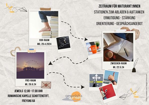 Das Team der Gesprächsinsel lädt an drei Tagen unmittelbar vor, während und nach den Maturaprüfungen zu einem „Zeitraum“ in der Romanischen Kapelle ein, in der verschiedene Stationen zum Abladen und Durchatmen, zum spirituellen Auftanken und zur Stärkung vorbereitet sind. Zudem besteht das Angebot mit einem/einer Seelsorger/in auf Wunsch ins Gespräch zu kommen.